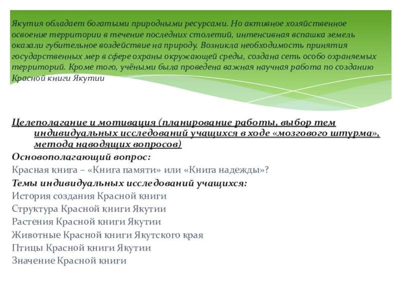 Якутия обладает богатыми природными ресурсами. Но активное хозяйственное освоение территории в течение последних столетий, интенсивная вспашка земель оказали губительное воздействие на природу. Возникла необходимость принятия государственных мер в сфере охраны окружающей среды, создана сеть особо охраняемых территорий. Кроме того, учёными была проведена важная научная работа по созданию Красной книги Якутии