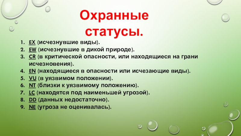 Охранные статусы.EX (исчезнувшие виды).EW (исчезнувшие в дикой природе).CR (в критической опасности, или находящиеся на грани исчезновения).EN (находящиеся