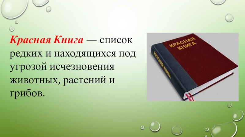Слайд 2Красная Книга — список редких и находящихся под угрозой исчезновения животных,