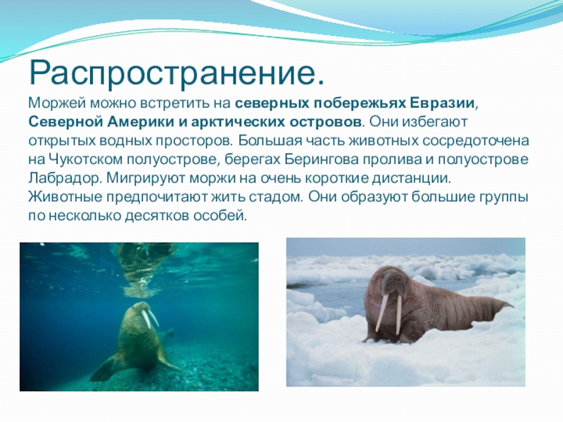 Распространение. Моржей можно встретить на северных побережьях Евразии, Северной Америки и арктических островов. Они избегают открытых водных