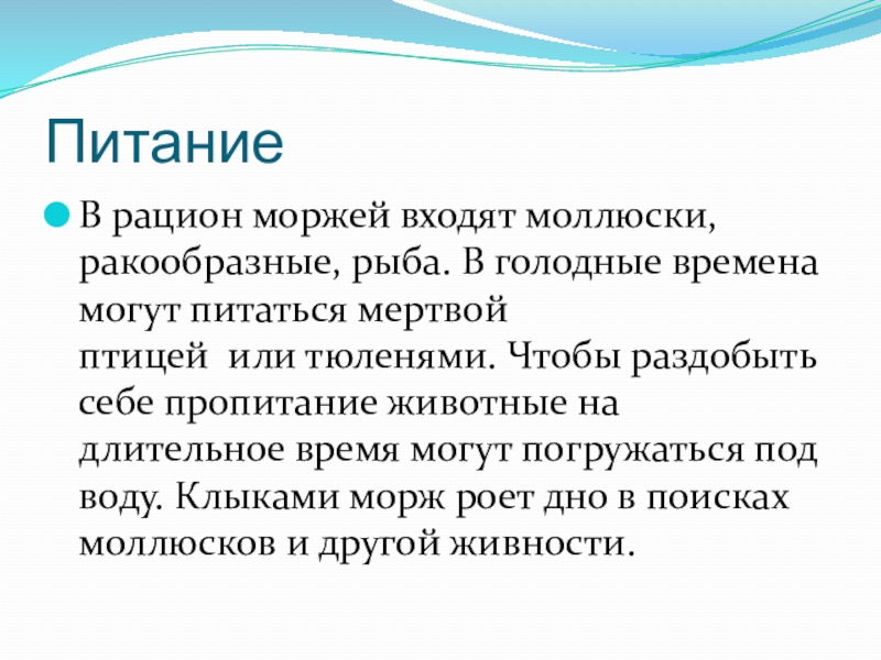 ПитаниеВ рацион моржей входят моллюски, ракообразные, рыба. В голодные времена могут питаться мертвой птицей  или тюленями. Чтобы раздобыть себе