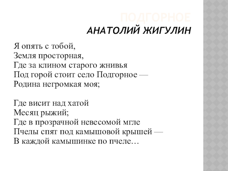 Подгорное Анатолий ЖигулинЯ опять с тобой, Земля просторная, Где за клином старого жнивья Под горой стоит село