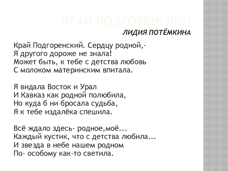 Край Подгоренский Лидия ПотёмкинаКрай Подгоренский. Сердцу родной,- Я другого дороже не знала! Может быть, к тебе с
