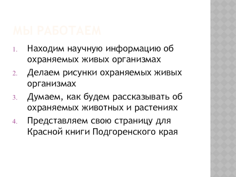 Мы работаемНаходим научную информацию об охраняемых живых организмах Делаем рисунки охраняемых живых организмахДумаем, как будем рассказывать об
