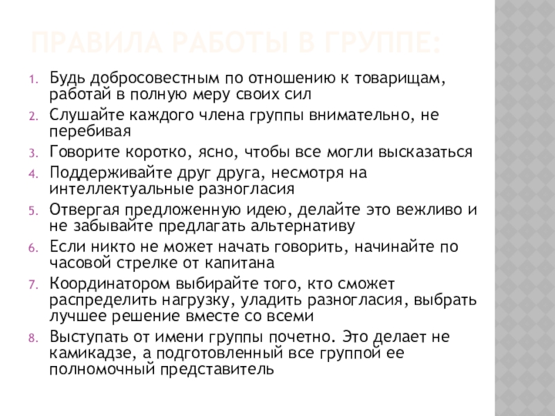 Правила работы в группе: Будь добросовестным по отношению к товарищам, работай в полную меру своих силСлушайте каждого
