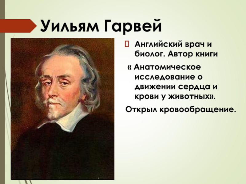 Уильям ГарвейАнглийский врач и биолог. Автор книги « Анатомическое исследование о движении сердца и крови у животных».
