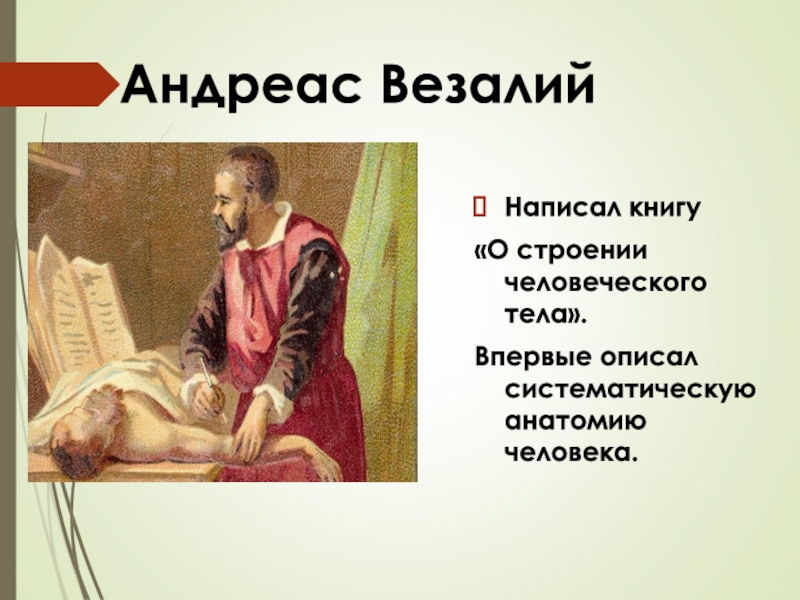 Андреас ВезалийНаписал книгу «О строении человеческого тела». Впервые описал систематическую анатомию человека.