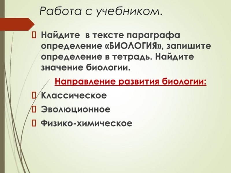 Работа с учебником.Найдите в тексте параграфа определение «БИОЛОГИЯ», запишите определение в тетрадь. Найдите значение биологии.Направление развития биологии:КлассическоеЭволюционноеФизико-химическое
