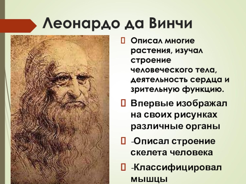Леонардо да ВинчиОписал многие растения, изучал строение человеческого тела, деятельность сердца и зрительную функцию.Впервые изображал на своих