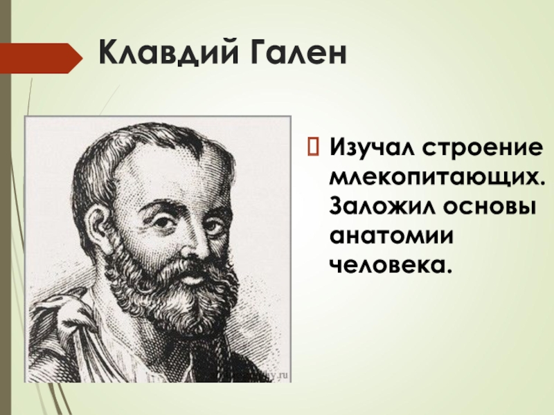 Клавдий ГаленИзучал строение млекопитающих. Заложил основы анатомии человека.