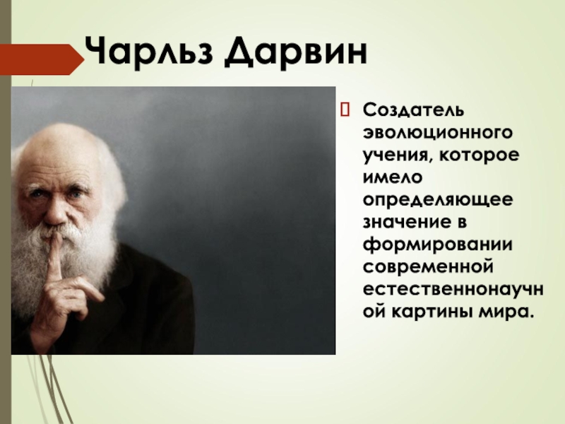 Чарльз ДарвинСоздатель эволюционного учения, которое имело определяющее значение в формировании современной естественнонаучной картины мира.