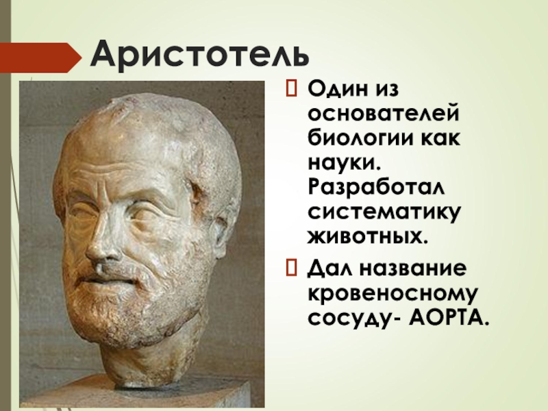 АристотельОдин из основателей биологии как науки. Разработал систематику животных.Дал название кровеносному сосуду- АОРТА.