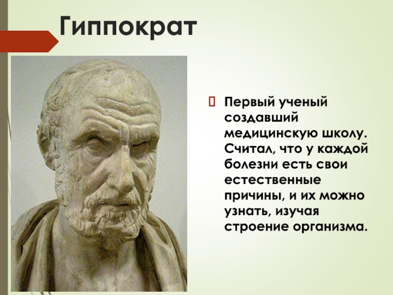 ГиппократПервый ученый создавший медицинскую школу. Считал, что у каждой болезни есть свои естественные причины, и их можно