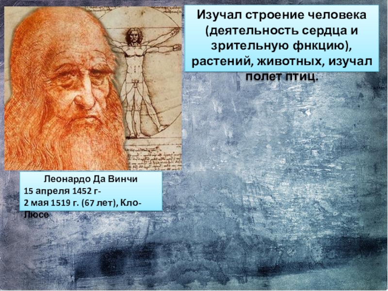 Изучал строение человека(деятельность сердца и зрительную фнкцию), растений, животных, изучал полет птиц.