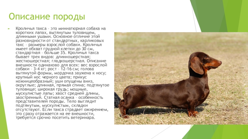 туловищем, длинными ушами. Основное отличие этой разновидности от стандартных, карликовых такс – размеры взрослой собаки. Кроличья имеет обхват грудной клетки до 30 см, стандартная – больше 35. Кроличья такса бывает трех видов: длинношерстная; жесткошерстная; гладкошерстная. Описание внешности одинаково для всех: вес взрослой собаки – 3-4 кг; рост – 12-16 см; голова вытянутой формы, мордочка заужена к носу; крупный нос черного цвета; прикус ножницеобразный; уши опущены вниз, округлые; длинная, прямая спина; подтянутое туловище; широкая грудь; мощные, мускулистые лапы; хвост средней длины, заостренный. Статная осанка – особенность представителей породы. Тело выглядит подтянутым, мускулистым, складки отсутствуют. Если такса страдает ожирением, это сразу отражается на ее внешности, требуется срочно посетить ветеринара.