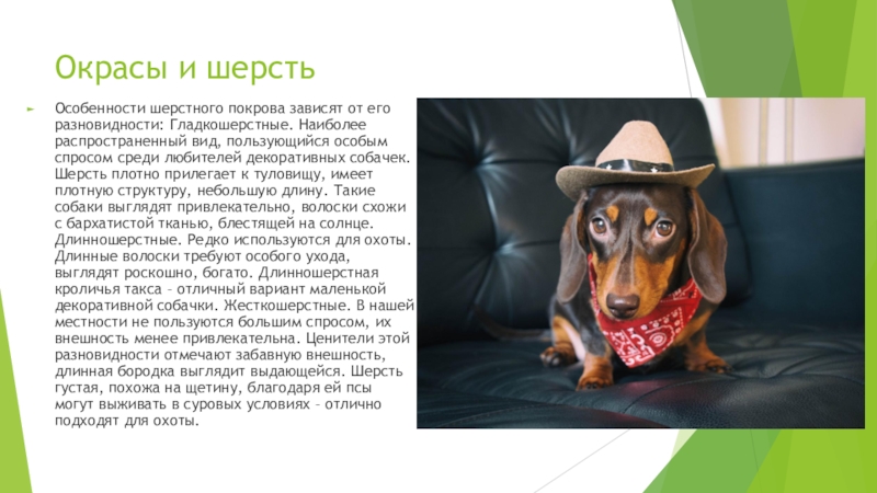распространенный вид, пользующийся особым спросом среди любителей декоративных собачек. Шерсть плотно прилегает к туловищу, имеет плотную структуру, небольшую длину. Такие собаки выглядят привлекательно, волоски схожи с бархатистой тканью, блестящей на солнце. Длинношерстные. Редко используются для охоты. Длинные волоски требуют особого ухода, выглядят роскошно, богато. Длинношерстная кроличья такса – отличный вариант маленькой декоративной собачки. Жесткошерстные. В нашей местности не пользуются большим спросом, их внешность менее привлекательна. Ценители этой разновидности отмечают забавную внешность, длинная бородка выглядит выдающейся. Шерсть густая, похожа на щетину, благодаря ей псы могут выживать в суровых условиях – отлично подходят для охоты.