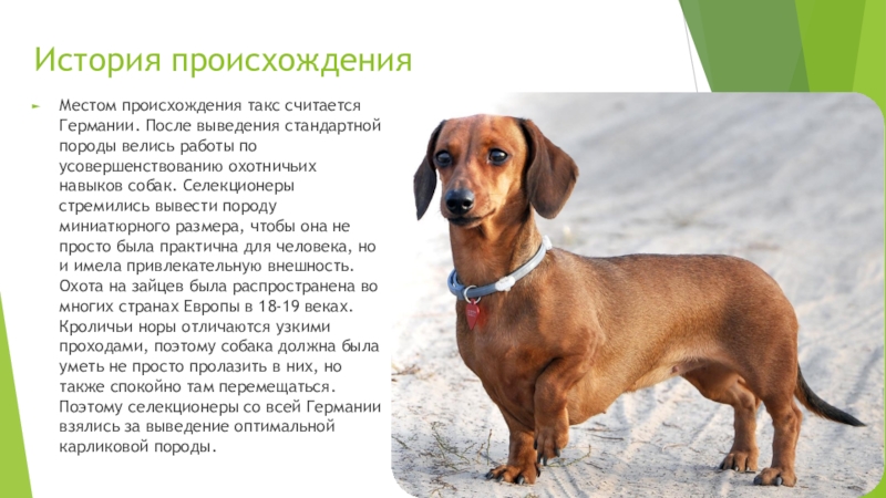 работы по усовершенствованию охотничьих навыков собак. Селекционеры стремились вывести породу миниатюрного размера, чтобы она не просто была практична для человека, но и имела привлекательную внешность. Охота на зайцев была распространена во многих странах Европы в 18-19 веках. Кроличьи норы отличаются узкими проходами, поэтому собака должна была уметь не просто пролазить в них, но также спокойно там перемещаться. Поэтому селекционеры со всей Германии взялись за выведение оптимальной карликовой породы.