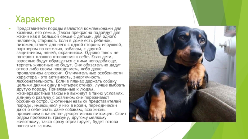 Представители породы являются компаньонами для хозяина, его семьи. Таксы прекрасно подойдут