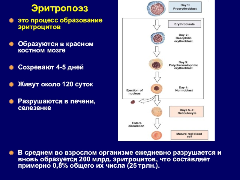 В среднем во взрослом организме ежедневно разрушается и вновь образуется 200 млрд. эритроцитов, что составляет примерно 0,8% общего их числа (25 трлн.).