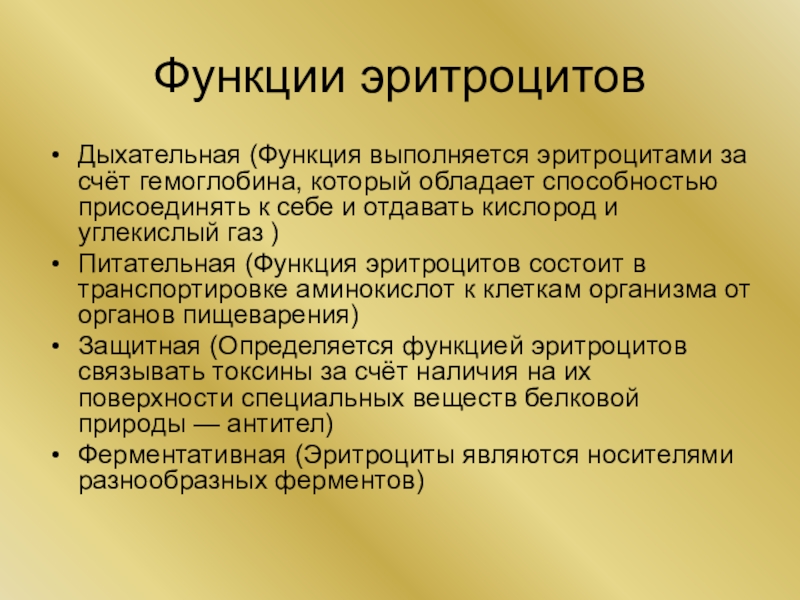 Функции эритроцитовДыхательная (Функция выполняется эритроцитами за счёт гемоглобина, который обладает способностью присоединять к себе и отдавать кислород