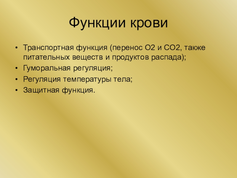 Функции кровиТранспортная функция (перенос О2 и СО2, также питательных веществ и продуктов распада);Гуморальная регуляция;Регуляция температуры тела;Защитная функция.
