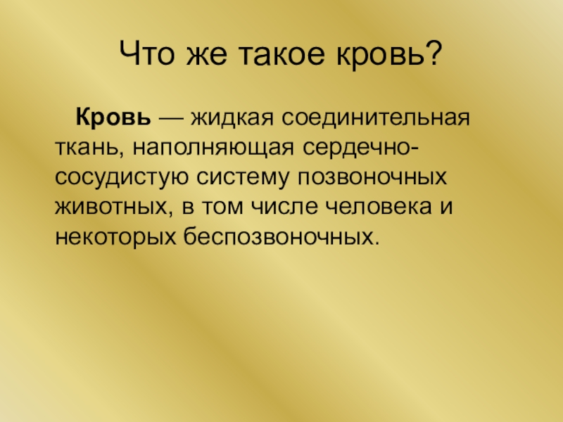 Что же такое кровь? Кровь — жидкая соединительная ткань, наполняющая сердечно-сосудистую систему позвоночных животных, в том числе человека и некоторых беспозвоночных.
