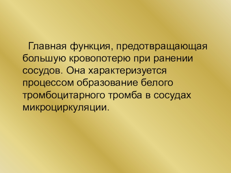 Главная функция, предотвращающая большую кровопотерю при ранении сосудов. Она характеризуется процессом образование белого тромбоцитарного