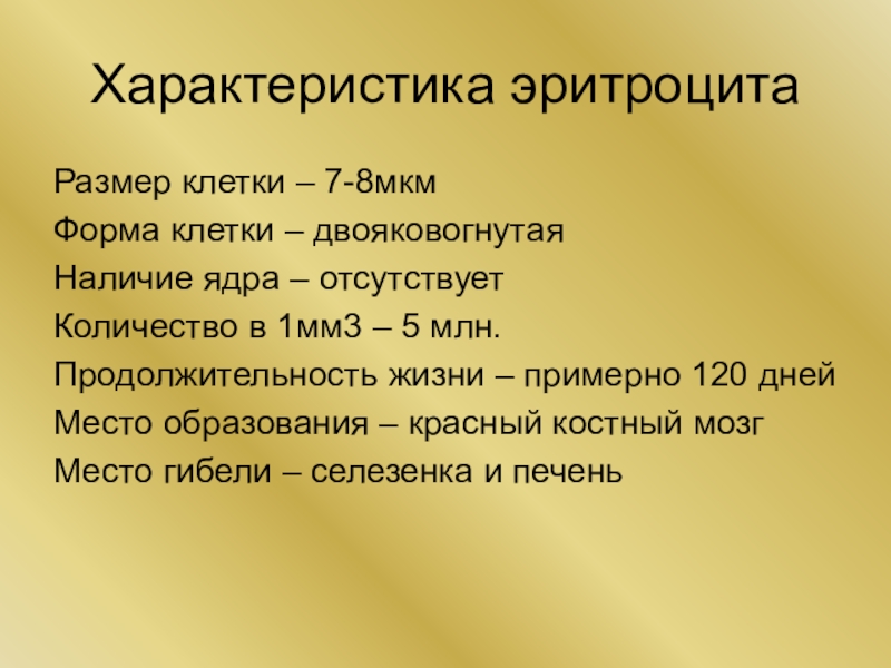Характеристика эритроцитаРазмер клетки – 7-8мкмФорма клетки – двояковогнутаяНаличие ядра – отсутствуетКоличество в 1мм3 – 5 млн.Продолжительность жизни