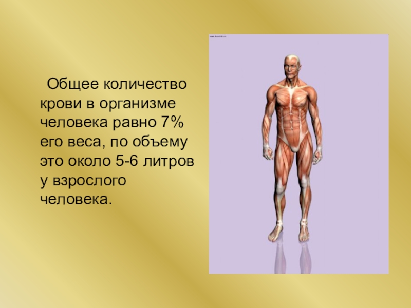Общее количество крови в организме человека равно 7% его веса, по объему это около
