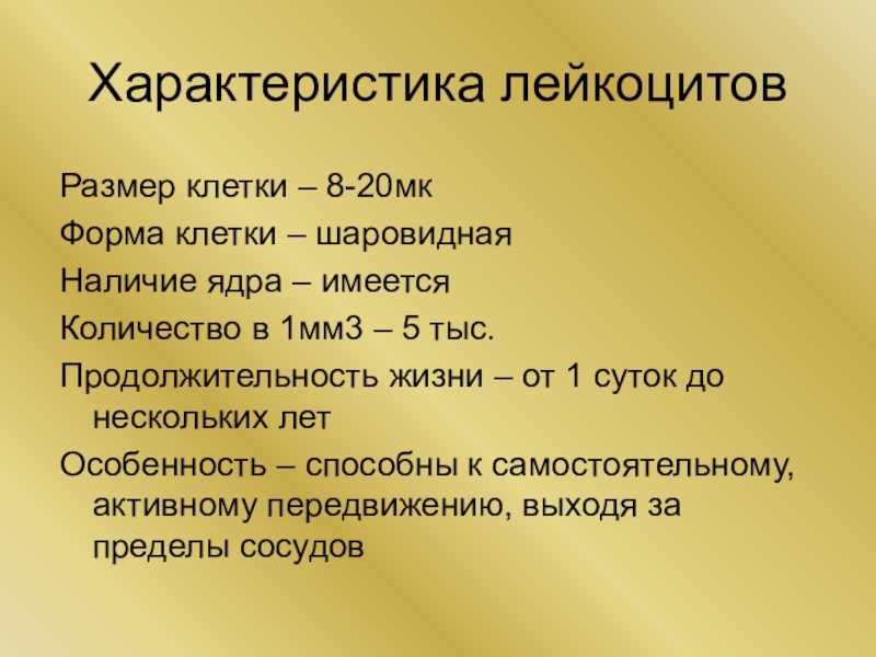 Характеристика лейкоцитовРазмер клетки – 8-20мкФорма клетки – шаровиднаяНаличие ядра – имеетсяКоличество в 1мм3 – 5 тыс.Продолжительность жизни