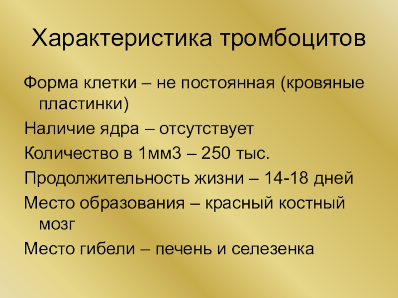 Характеристика тромбоцитовФорма клетки – не постоянная (кровяные пластинки)Наличие ядра – отсутствуетКоличество в 1мм3 – 250 тыс.Продолжительность жизни
