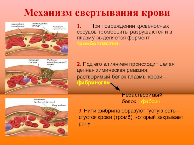 3. Нити фибрина образуют густую сеть – сгусток крови (тромб), который закрывает рану.