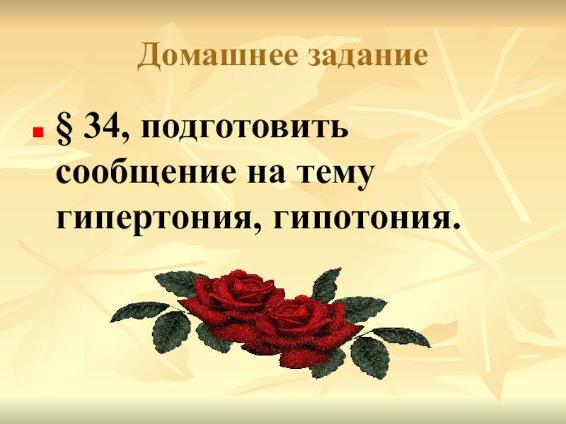 § 34, подготовить сообщение на тему гипертония, гипотония.