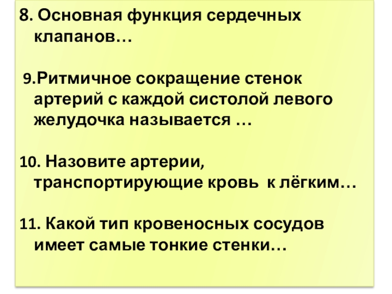 8. Основная функция сердечных клапанов… 9.Ритмичное сокращение стенок артерий с каждой систолой левого желудочка называется …10. Назовите