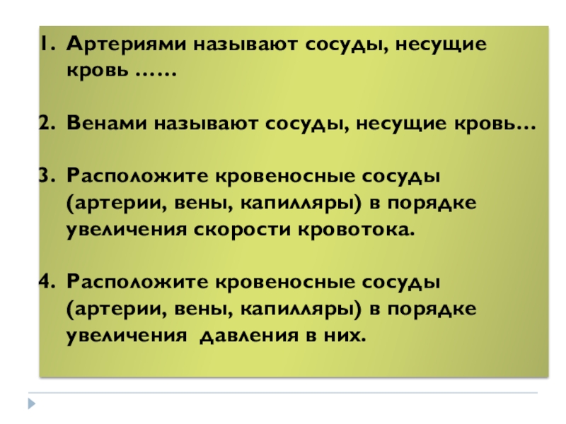 Артериями называют сосуды, несущие кровь ……Венами называют сосуды, несущие кровь…Расположите кровеносные сосуды (артерии, вены, капилляры) в порядке увеличения скорости кровотока.Расположите кровеносные сосуды (артерии, вены, капилляры) в порядке увеличения давления в них.