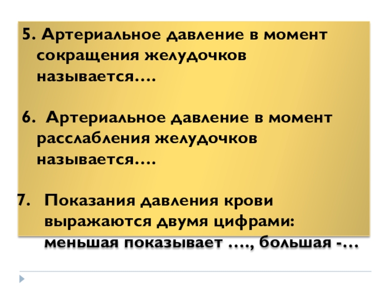 5. Артериальное давление в момент сокращения желудочков называется….6. Артериальное давление в момент расслабления желудочков называется….Показания давления крови