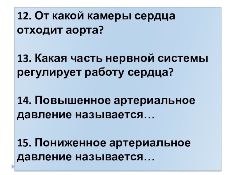 12. От какой камеры сердца отходит аорта?13. Какая часть нервной системы регулирует работу сердца?14. Повышенное артериальное давление