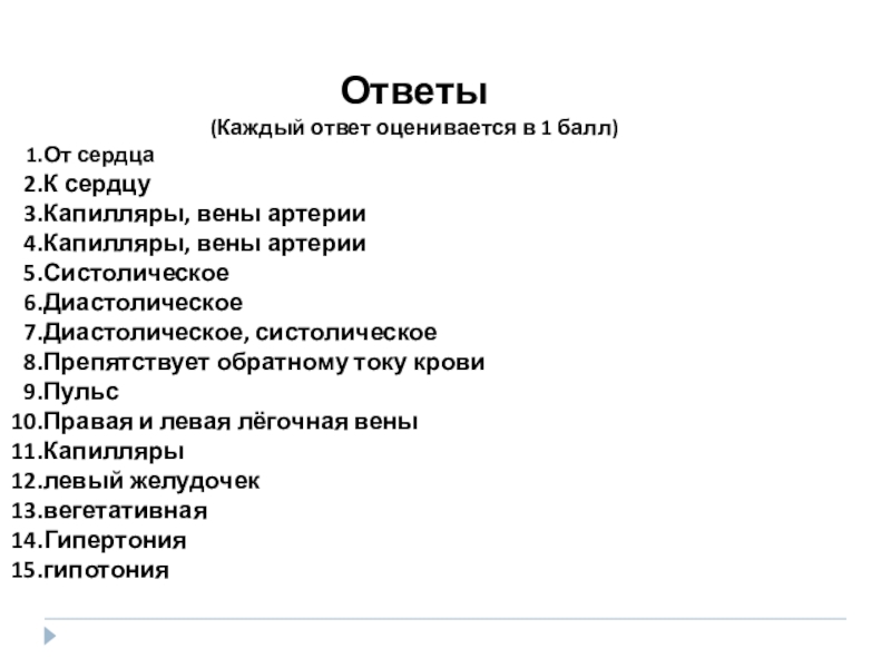 Ответы(Каждый ответ оценивается в 1 балл)От сердцаК сердцуКапилляры, вены артерииКапилляры, вены артерииСистолическоеДиастолическоеДиастолическое, систолическоеПрепятствует обратному току кровиПульсПравая и