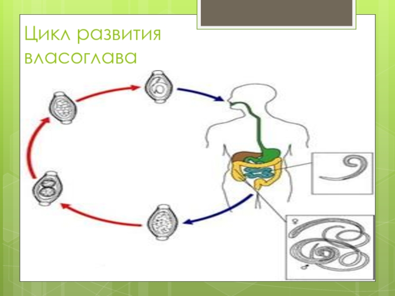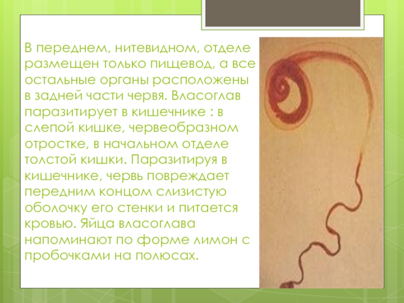 расположены в задней части червя. Власоглав паразитирует в кишечнике : в слепой кишке, червеобразном отростке, в начальном отделе толстой кишки. Паразитируя в кишечнике, червь повреждает передним концом слизистую оболочку его стенки и питается кровью. Яйца власоглава напоминают по форме лимон с пробочками на полюсах.