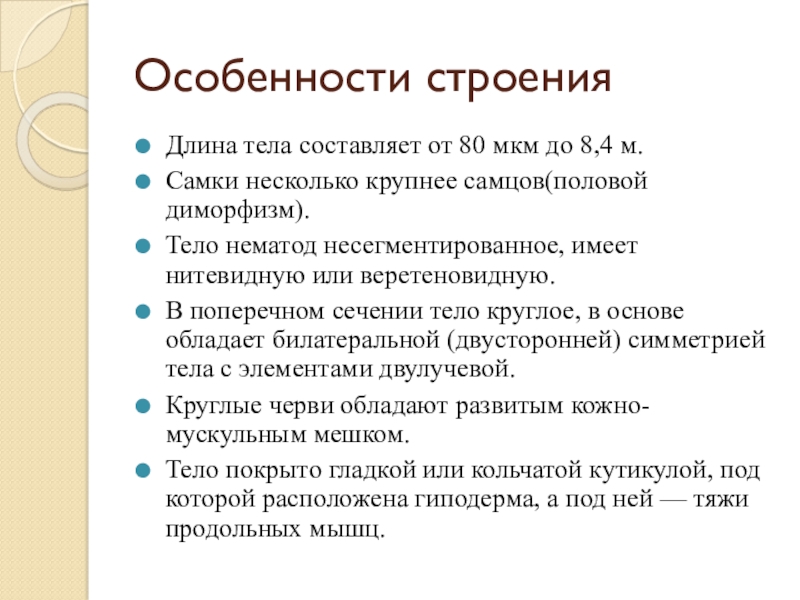 Тело нематод несегментированное, имеет нитевидную или веретеновидную.