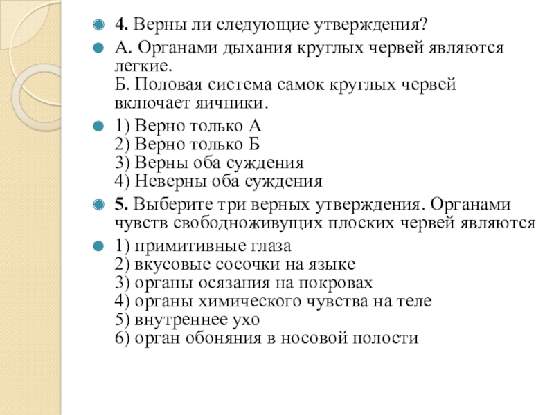 5. Выберите три верных утверждения. Органами чувств свободноживущих плоских червей являются