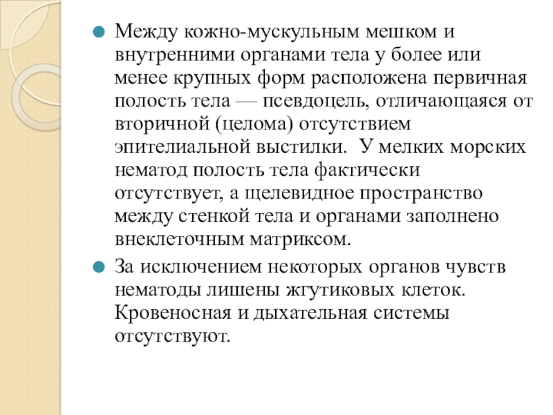 крупных форм расположена первичная полость тела — псевдоцель, отличающаяся от вторичной (целома) отсутствием эпителиальной выстилки. У мелких морских нематод полость тела фактически отсутствует, а щелевидное пространство между стенкой тела и органами заполнено внеклеточным матриксом.
