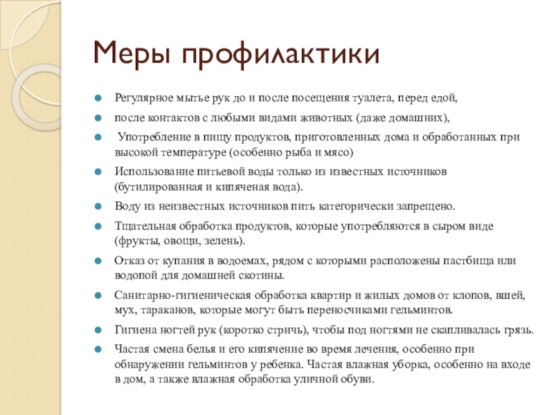 Частая смена белья и его кипячение во время лечения, особенно при обнаружении гельминтов у ребенка. Частая влажная уборка, особенно на входе в дом, а также влажная обработка уличной обуви.