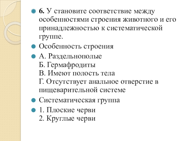 Слайд 156. У становите соответствие между особенностями строения животного и его принадлежностью к