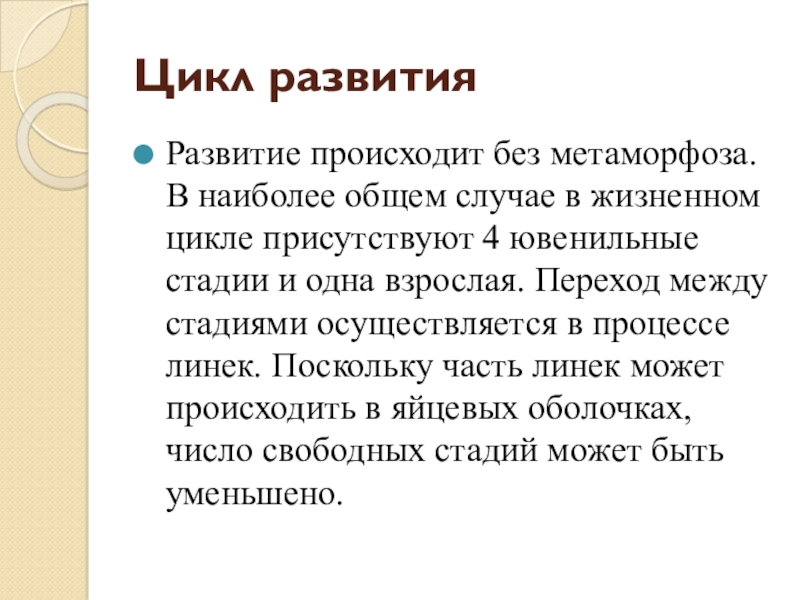 Развитие происходит без метаморфоза. В наиболее общем случае в жизненном цикле