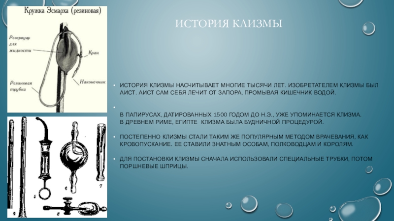 И только в 19 веке австрийский медик изобрел одно из самых эффективных средств борьбы с различными болезнями – кружку Эсмарха, которая и сегодня остается самым удобным способом очистки кишечника. Меняется лишь материал, из которго ее изготовляли: сначала металл, потом стекло, сейчас резина или пластик.