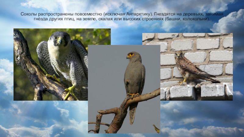 Слайд 9Соколы распространены повсеместно (исключая Антарктику). Гнездятся на деревьях, занимая гнёзда других