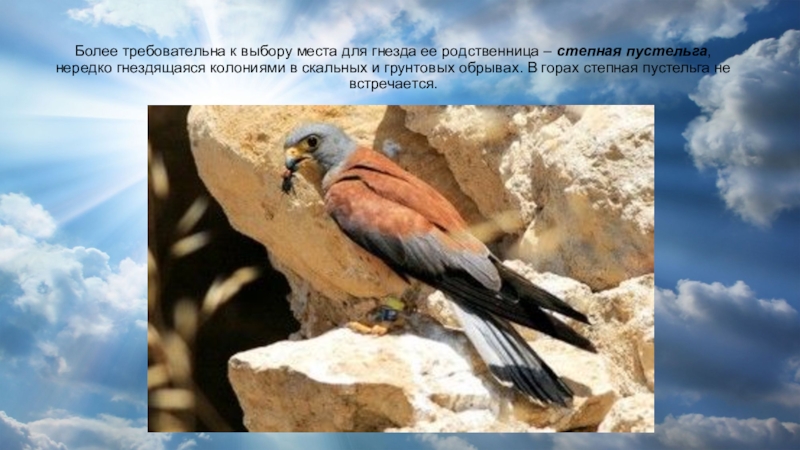 пустельга, нередко гнездящаяся колониями в скальных и грунтовых обрывах. В горах степная пустельга не встречается.
