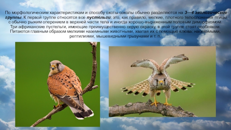 Слайд 11По морфологическим характеристикам и способу охоты соколы обычно разделяются на 3—4