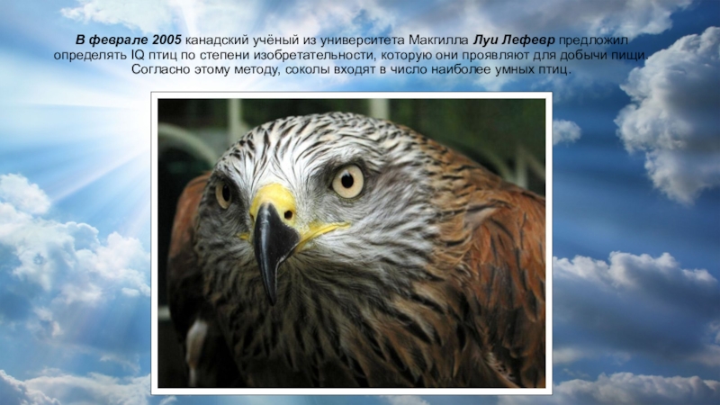 определять IQ птиц по степени изобретательности, которую они проявляют для добычи пищи. Согласно этому методу, соколы входят в число наиболее умных птиц.